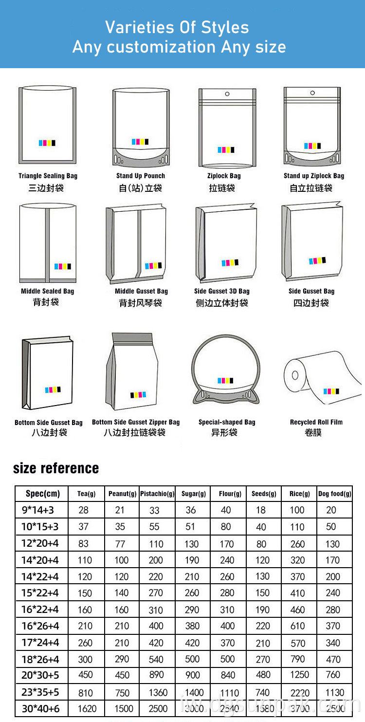 אנו מקבלים גדלים ועיצוב מותאמים אישית. כל שקיות האריזה שלנו מיוצרות בהתאמה אישית על בסיס יצירות האמנות וצורך האריזה שלך.